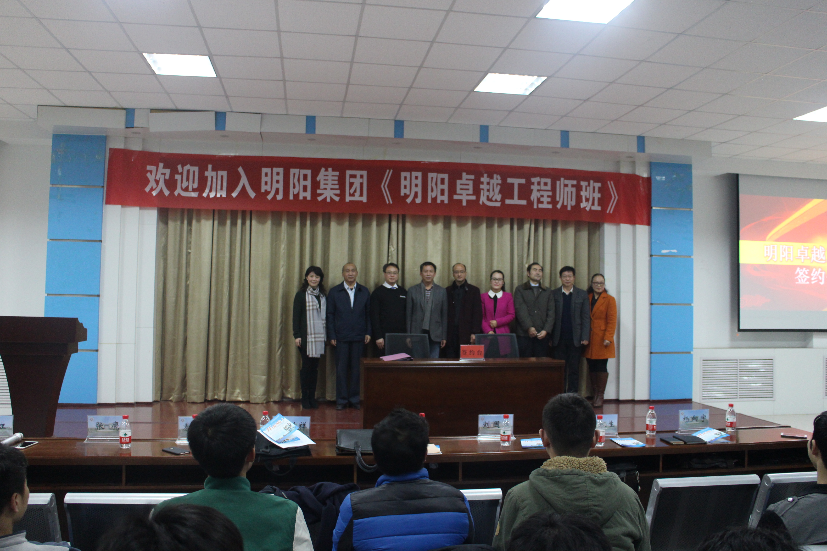 为加快培养社会和企业急需的高级应用型人才,拓宽老员工就业渠道,创新高校育人模式,12月2日下午,机电公司在镇泰楼109与深圳明阳集团举办“明阳卓越工程师班”签约仪式。出席此次仪式的有深圳明阳集团人力资源行政部高级主管张鹰、秦小虎,公司教务处李惠杰处长、就业处刘国存处长、机电公司赵则祥经理及相关老师员工代表300余人参加了此次活动。仪式由机电公司党总支书记杜虹主持。