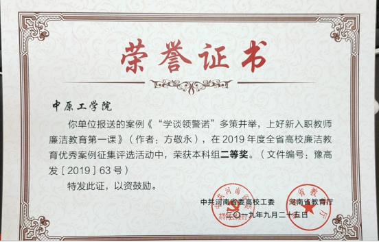近日,省委高校工委、省教育厅下发了《关于公布2019年度全省高校廉洁教育优秀案例征集活动评选结果的通知》,公司选送的《“学谈领警诺”多策并举,上好新入职教师廉洁教育第一课》荣获案例类二等奖。