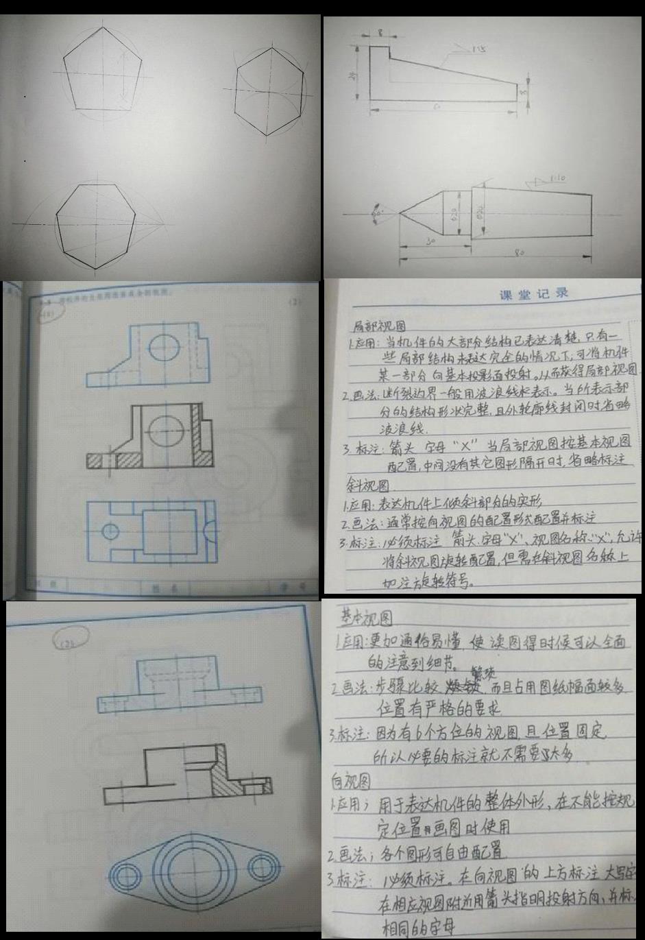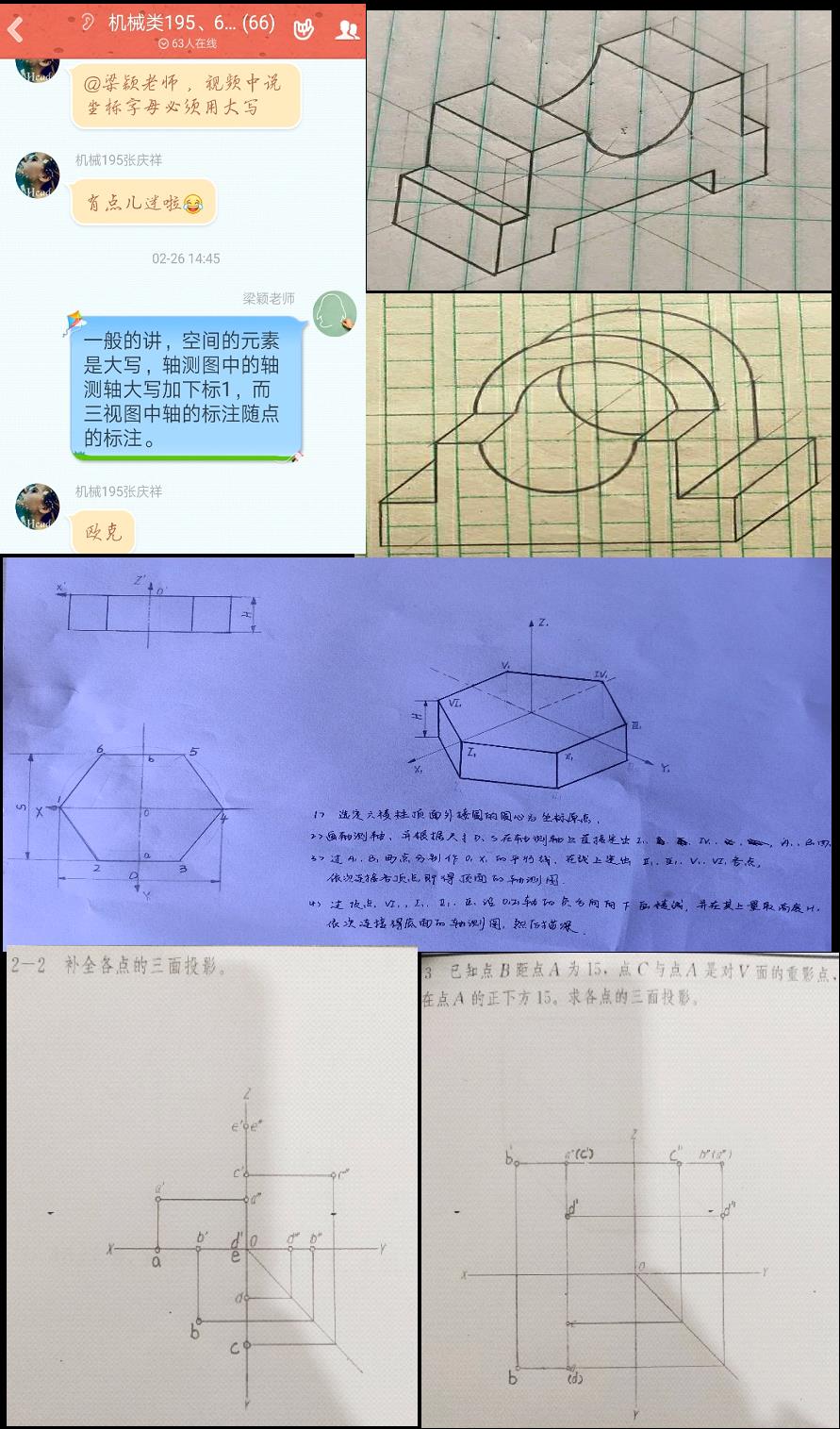 老师们准备课程尽力尽力,同学们学起来也是热情高涨。机械制图课需要大量课后练习,但同学们并没有因为在家中缺少绘图工具而减少训练。大家纷纷开动脑筋,有的找出高中时用的圆规、尺子和铅笔,有的发现了高考时用的神器——试卷垫。还有些同学家里连作业纸都没有,便翻出其他功课的作业本画图……就在这样有限的条件下,同学们克服种种不便,交出了一张又一张漂亮的图样。