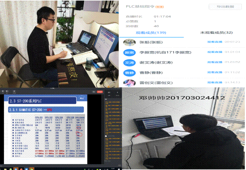 空间的距离,并未能阻隔师生们心与心的连接,也挡不住同学们对知识的渴望。公司机械电子系教师靳继勇老师本学期开设的《可编程控制器应用》是一门专业任选课,主讲PLC数据类型、存储区与寻址方式,指导员工练习S7-200系列PLC编程指令分类、位逻辑指令、置位复位指令;靳老师通过钉钉平台进行直播,原本56名员工选修的课程,实际听课人数高达130人,员工们纷纷进入直播课堂,取得了较好的授课效果。靳老师曾荣获“河南省教学标兵的”称号,这次疫情期间开展的线上教学,他积极参与公司组织的各种线上教学平台培训,课下认真备课,授课通过弹幕讨论、电子版书等方式开展教学互动,详细罗列知识框架,让知识点一目了然,取得了实体课堂没有的效果。线上教学激发了员工主动学习的积极性,更多的员工愿意参与到直播课堂。