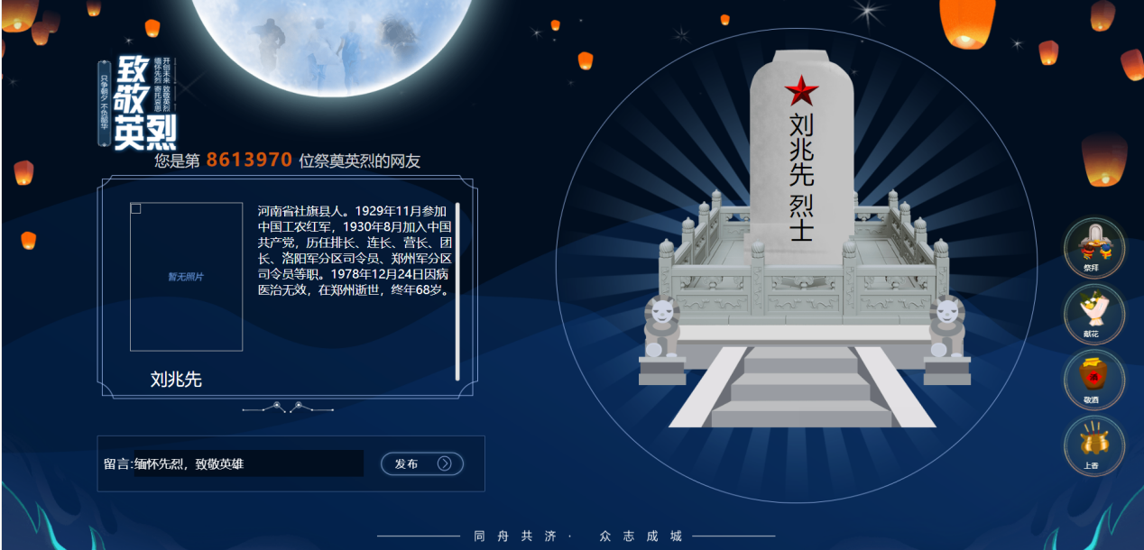 缅怀先烈、寄托哀思,重于心而不拘于形,目前正是疫情防控的关键时期,为避免人群聚集、降低交叉感染风险,公司特开展了网上祭奠活动,缅怀先烈,向在共和国英烈及本次战“疫”中殉职的医护、公安等抗“疫”一线的逆行者们致敬!全体师生登录中华英烈网开设的专题、专栏,了解党史、国史和革命英模事迹,积极向英模献花、撰写留言寄语,弘扬爱国精神,传承红色基因。