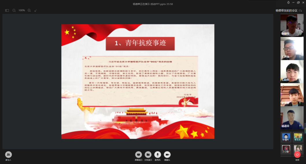 紧接着,在“硬核抗疫显青年担当”这一阶段中,团支书带领同学们一起学习了抗疫战争中涌现的青年榜样及我们身边的榜样。北大援鄂医疗队的故事,90后大一新生朱傲冰主动报名成为新冠疫苗临床试验志愿者,在零下3度的山顶待4小时只为上网课的藏族老员工斯朗巴珍,疫情期间我们身边的同学积极投身志愿服务的典型事迹……一个个温暖的故事都体现着青年在这场战争中体现出来的抗疫精神:攻坚克难的奋斗与斗争精神、积极作为的责任与担当精神、充满信心的乐观与团结精神。随后大家一起学习了“习近平总书记致北大援鄂医疗队‘90后’党员的回信“,团支书杨德草告诉大家:我们都是收信人,我们要把总书记的谆谆教导和殷切希望内化于心、外化于行,把抗疫精神融入身心,以抗疫精神奋力书写自己的美好未来,寻找属于青年人真正的“诗和远方”!