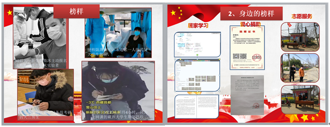 以抗疫精神奋力书写青年人的“诗和远方”阶段,以主题交流讨论的形式进行。“你心目中的抗疫精神是什么?”“对新时代的青年来说,怎样才能追求属于我们自己‘诗和远方’?”大家认真思考、积极讨论,分享感悟。机自183疫情网格负责人刘朋伟同学说我们青年人要真正做到在灾难中与祖国共奋进、共成长,每一位同学都要把把远大理想与脚踏实地结合起来,用汗水浇灌承诺,不断促进自自身成长,才能寻找我们的“诗和远方”。