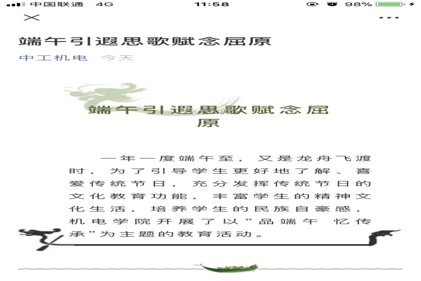此次端午节活动,不仅引导机电师生更好地了解、喜爱传统节日,也充分发挥了传统节日的文化育人功能,丰富了师生的精神文化生活,培养了师生的民族自豪感。
