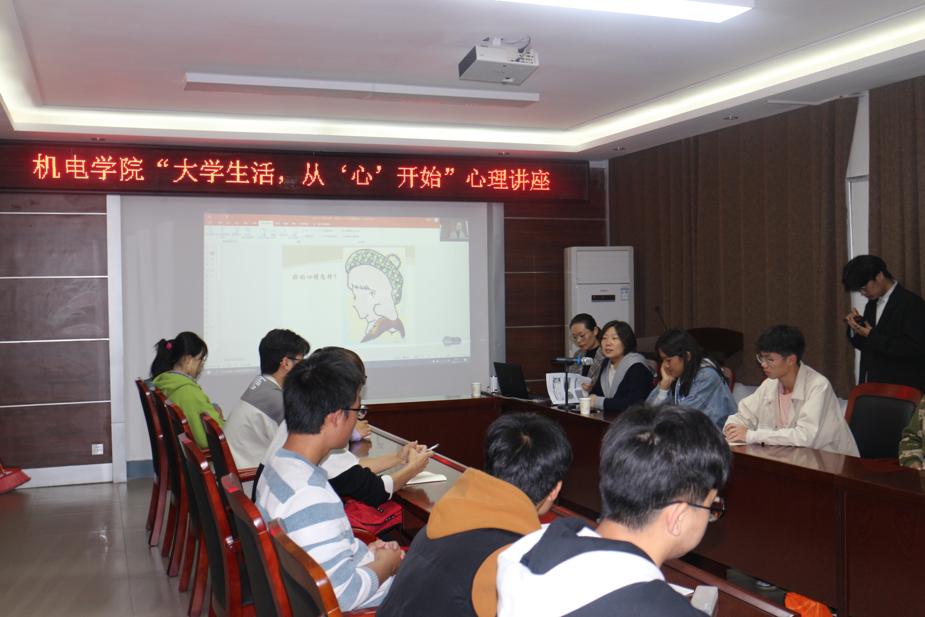 笑一笑,十年少;忧一忧,白了头。恰同学少年,风华正茂,新时代青年应德智体美全面发展,提高成绩、强健体魄的同时也要注重保持心理健康,毕竟微笑的曲线可以抚平所有的困难。为了进一步帮助2020级新生适应老员工活,保持健康的心理状态,2020年11月12日下午6时,机电公司“老员工活,从‘心’开始”心理讲座于8号楼301会议室准时召开。该讲座特邀校心理健康中心主任陈慧老师开讲,机电公司党委副书记李云老师主持。为了扩大覆盖面,提升效果,讲座采取线上、线下同步进行的方式,班级主要员工干部、心理委员、团总支员工会心理部成员线下参与,20级全体员工线上参与。在这个冬风瑟瑟,寒风凛冽的晚上,301会议室却显得格外温暖。
