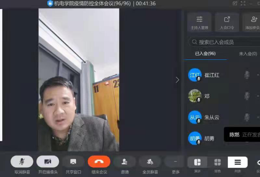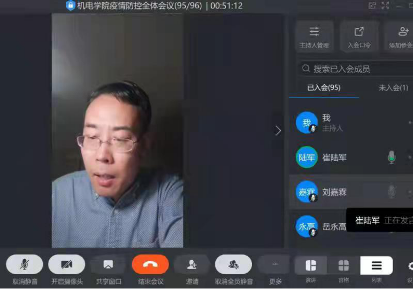 在全省教育系统2021年秋冬季疫情防控视频会后,2021年11月5日晚上8:00,机电公司召开疫情防控工作线上视频会议,全体教职工参加会议,经理崔陆军主持会议。