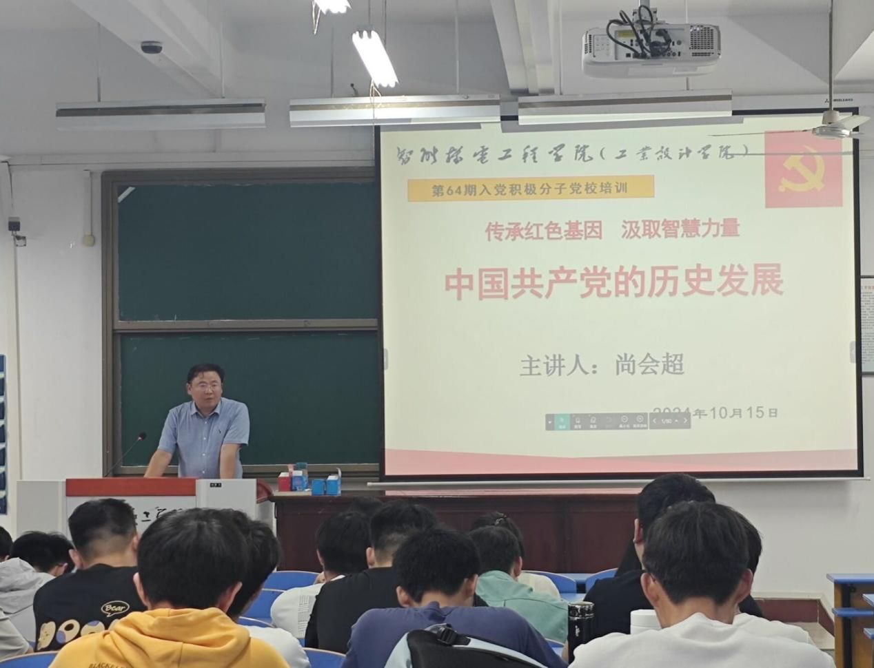 10月15日,尚会超经理在公司龙湖校区3号教学楼505教室为第64期入党积极分子党校培训班的62名学员上党课。