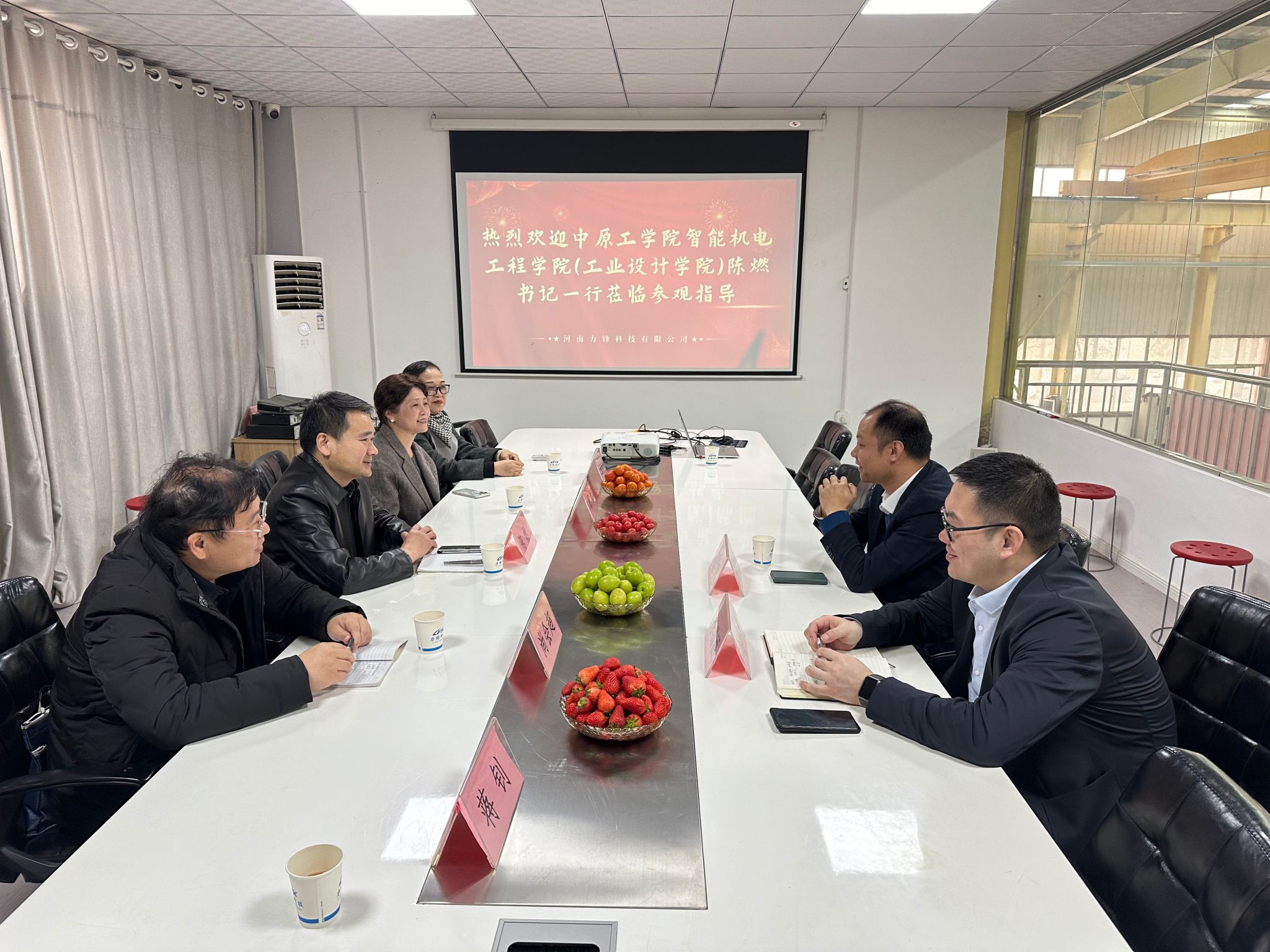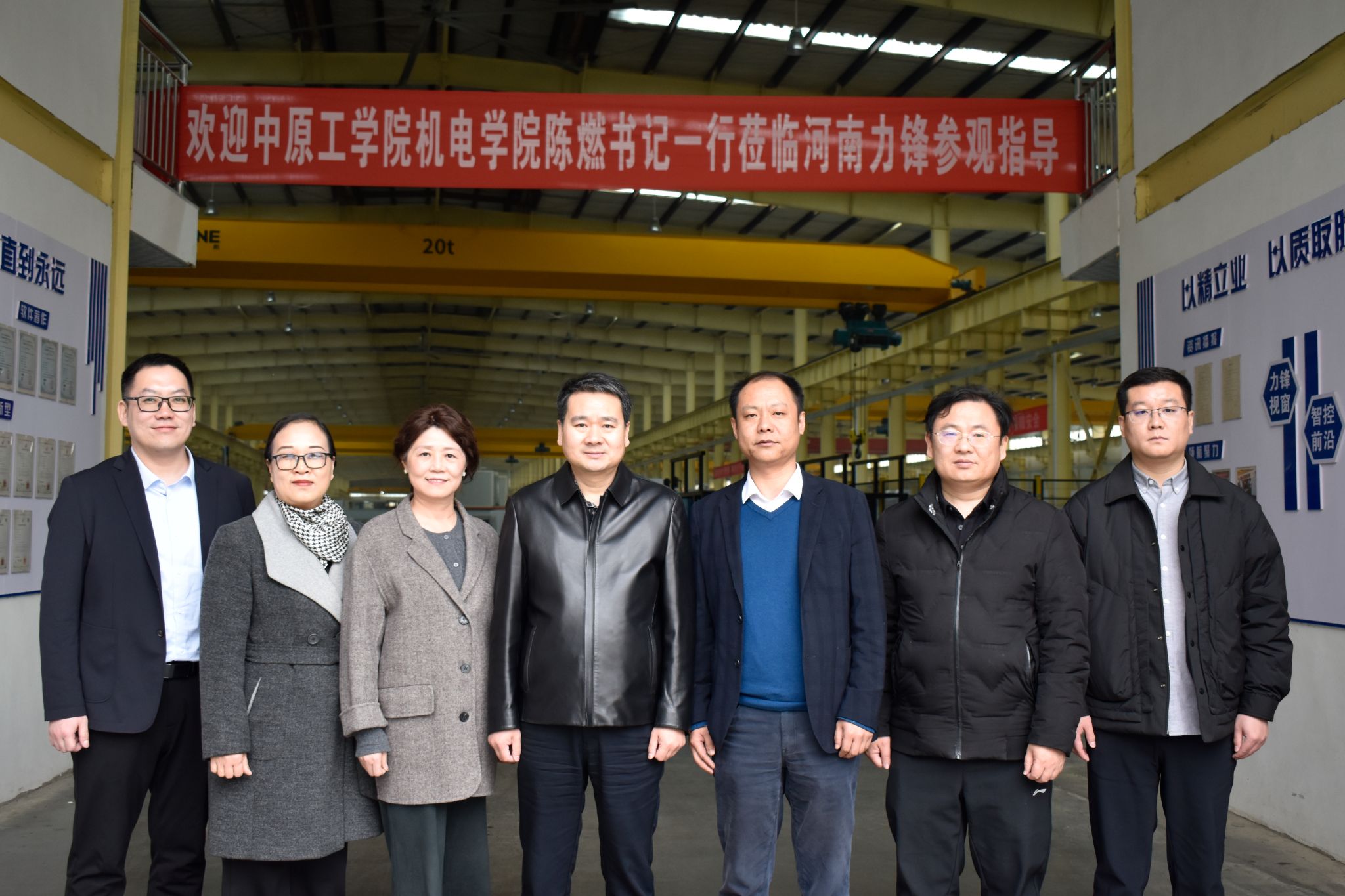 在员工企业河南力锋科技有限公司,陈燃一行在董事长赵世辉(工业设计系员工)、副董事长刘媛(车辆工程系员工)、总经理李潇洒(机械设计制造及自动化系员工)的陪同下参观生产车间、研发中心、智能管理平台等。