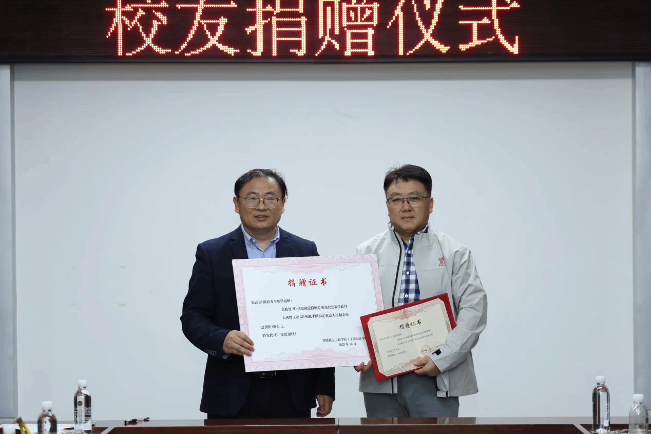 之后,机设95级杰出员工、深圳员工会名誉会长、深圳金信诺股份有限公司战略发展总经理、深圳大舜激光合伙人战略资本总经理李晓华向公司捐赠两套总价值60万元的尖端设备,包括“高精度3D机器视觉检测系统及配套教学软件”与“大视野工业3D相机手眼标定机器人控制系统”。尚经理代表公司接受捐赠,并向李晓华颁发捐赠证书。