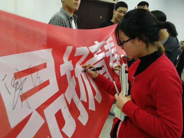 最后,同学们积极响应并在《机电公司学风建设倡议书》和宣传条幅上签下了自己的名字。