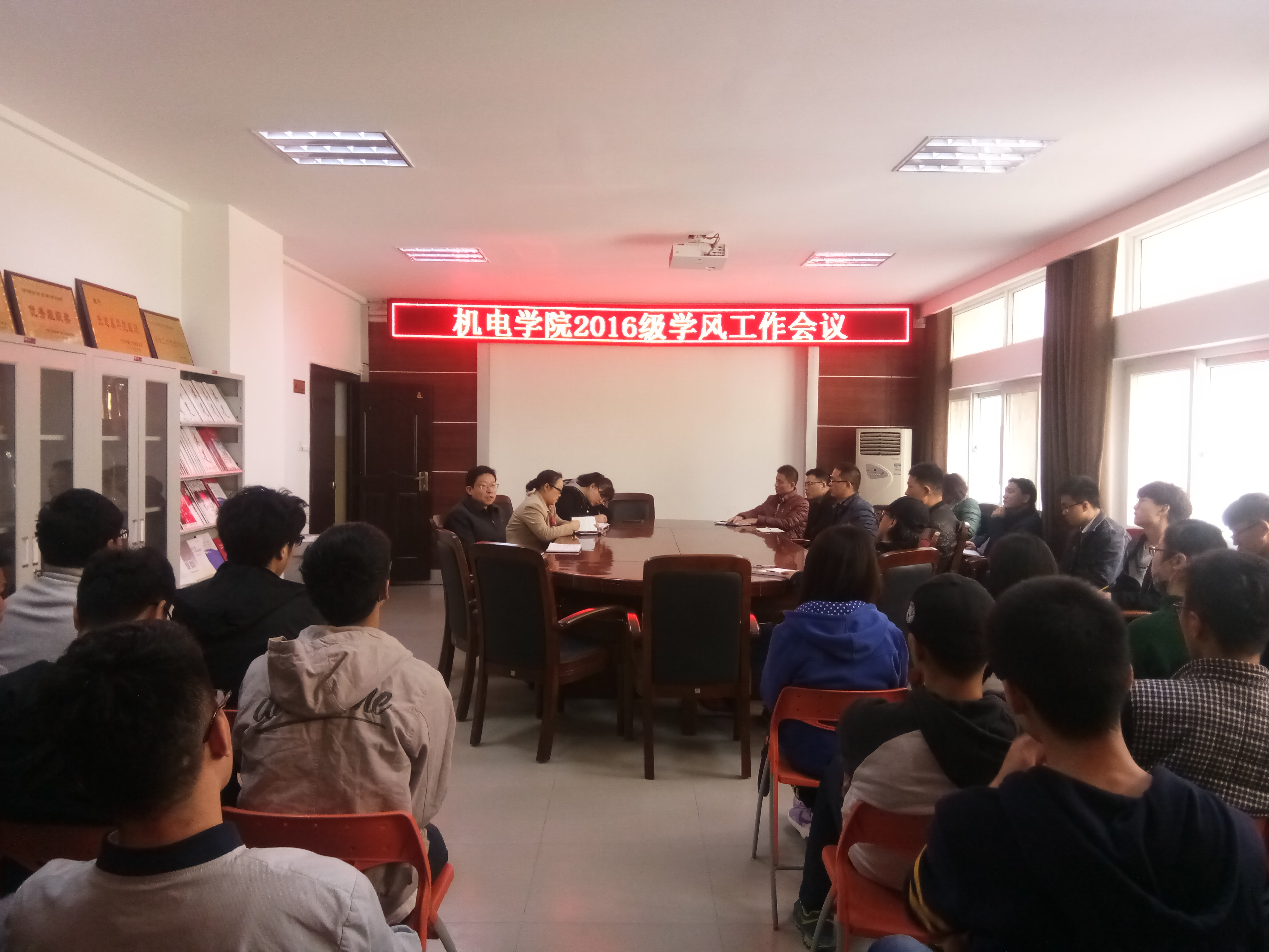 2017年3月28日中午12:30,机电公司在8#楼301会议室召开了关于16级新生学风建设工作会议。出席会议的老师有机电公司副书记杨向宇、学工办主任魏茜、16级全体班主任。参加会议的为大一各班员工代表,本次会议由魏老师主持。
