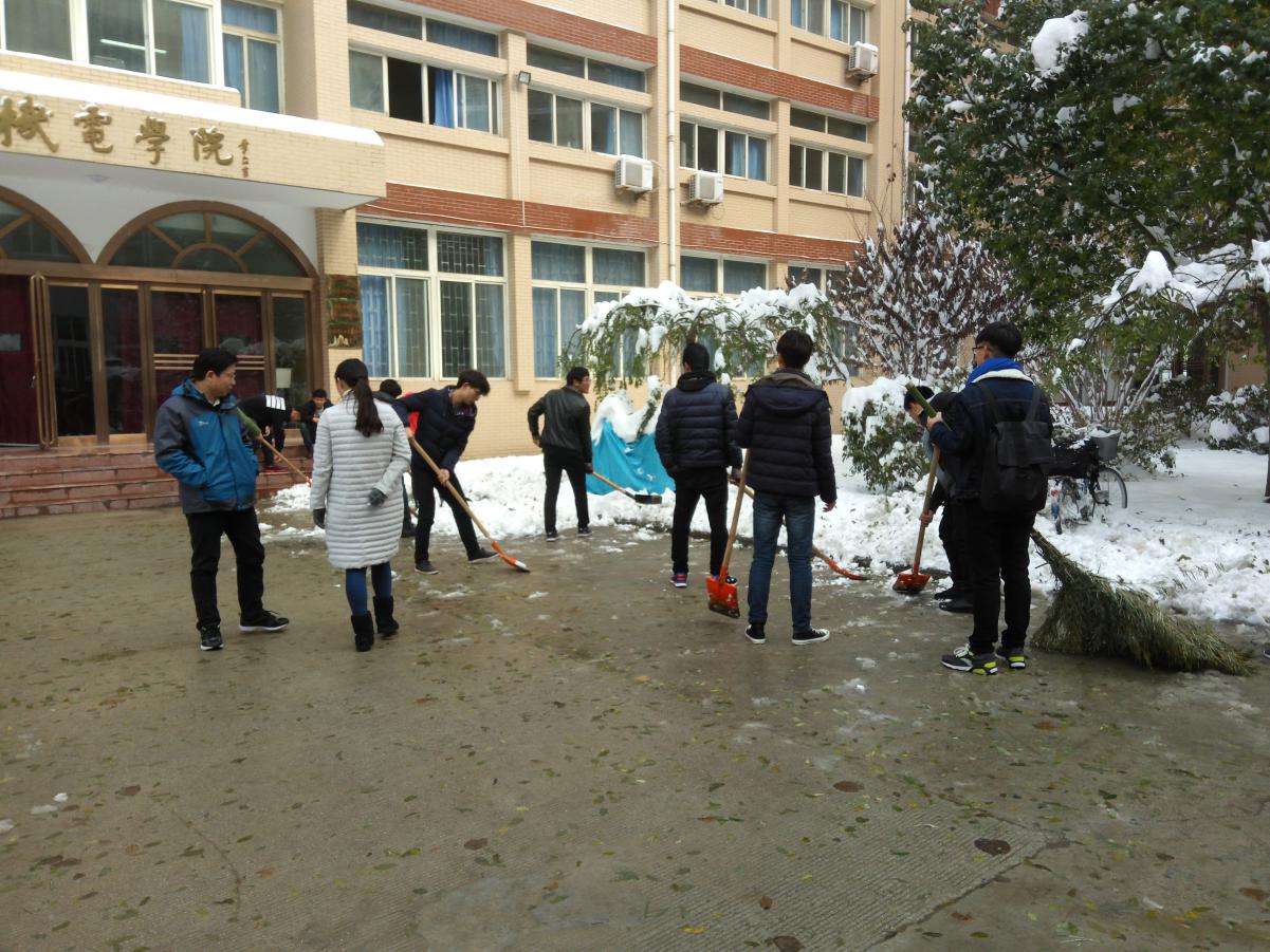 2016年11月22日,郑州下起暴雪,导致公司内路面积雪严重,这使得在校师生出行格外困难。为了在校师生的行走安全,于次日,机电公司以“扫雪送温暖,文明我先行”为口号开始组织同学清扫八号楼楼下的积雪。