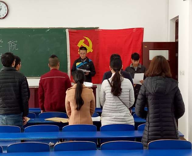 会议开始时,全体成员起立,唱《国际歌》。会议上,由申请人宣读《入党申请书》并由入党介绍人介绍其情况,然后申请人回避,在场的党员酝酿讨论,充分发表意见。接着党员们举手表决,表决结果通过了相关议题。辅导员宣读了党支部意见,并对9名新党员表示祝贺,希望新老党员要加强政治理论学习,保持与党的政策高度一致;加强组织性、纪律性,发挥模范带头作用。