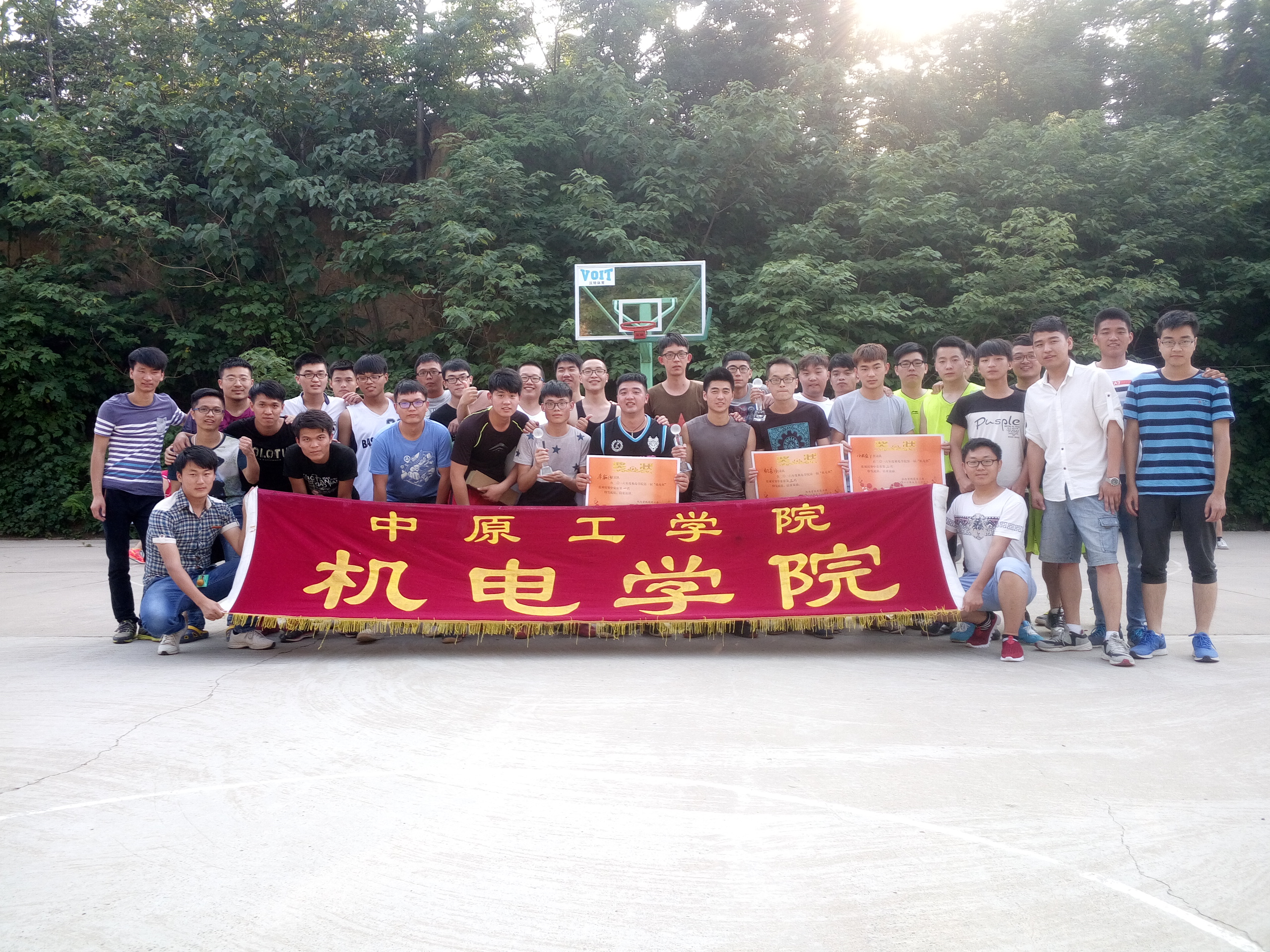 快门轻按,让时间定格。提笔挥墨,将盛事庆贺。2016年5月29日,由机电公司党团工委策划举办的首届“机电杯”篮球比赛圆满结束。历经半个多月的组织和安排,此次篮球比赛在广老员工和老师的大力支持下有条不紊的进行。此次篮球比赛三个年级共14个代表队参赛,5月28日进行了小组赛和半决赛。淘汰、晋级,运动员在呐喊和喝彩中拼搏,5月29日上午进行了决赛,比赛更是进入了白热化状态,受伤队员依然带伤上阵。下午的总决赛更是异常激烈,车辆13级代表队打出了75:41的高分!此时无论运动员与观众已无人在乎输赢,只是在享受运动带来的激情。最终车辆13级代表队以绝对的优势取得冠军,机自13级与机自14级代表队分别获得亚军与季军。赛后党团工委为获奖代表队颁发了奖杯和奖状。