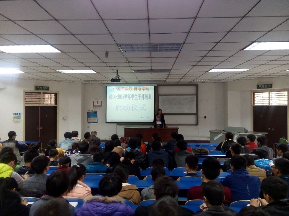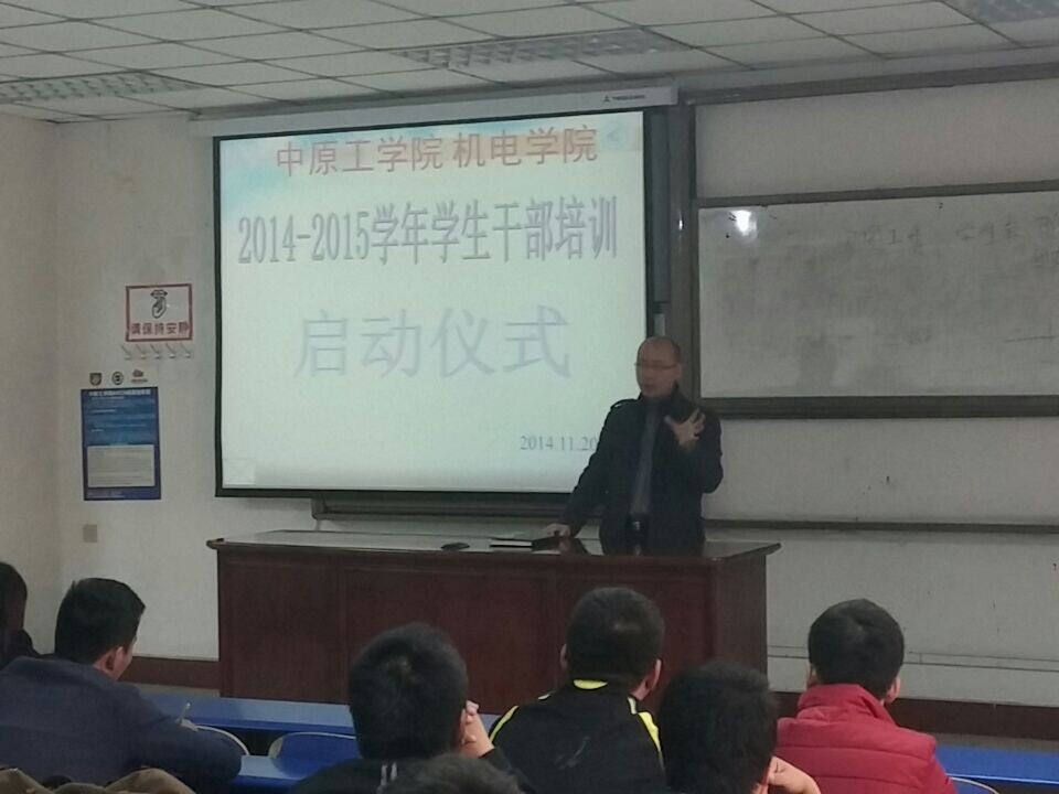 2014年11月20日,星期四,中午11:20,公司2014-2015学年员工干部培训启动仪式在4号教学楼201室举行。党总支副书记李士杰,辅导员张林静、王芳出席本次会议。同时与会的人员还有全体员工会成员、党团工委成员及2014级各班班长、团支书。