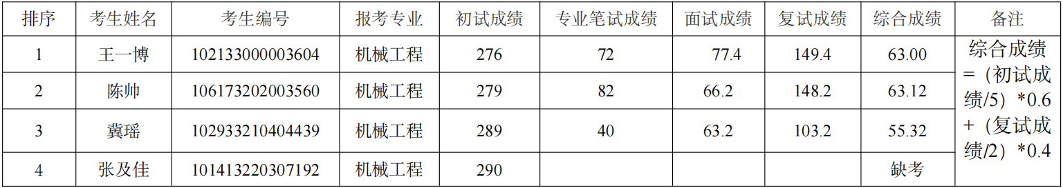 按照公司招生工作安排,机电公司2023年硕士研究生复试工作(调剂考生)于4月12日进行。根据复试情况,现将考生复试成绩公示如下: